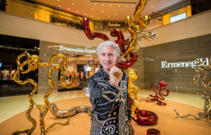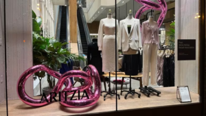 Artizia stworzyła witrynę sklepową, w której znalazły się różowe, spiralne rzeźby.