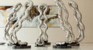 Podobnie jak rzeźby TANGLE, większość rzeźb [Aritzii] składa się z osiemnastu powiązanych ze sobą elementów składowych, [a] dodatkowo jasnorożowy kolor i chromowane wykończenie [rzeźb Aritzii] są identyczne z chromowanym różowym kolorem używanym przez [Tangle] w Palm Metallic Pink.